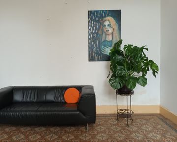 Het salon heeft een grootte van 22,5 m² en biedt een sfeervolle inrichting met comfortabele zetels en groene planten, wat zorgt voor een warme en uitnodigende ambiance. De perfecte balans tussen huiselijk en professioneel.